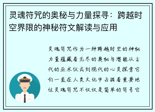 灵魂符咒,作为一种跨越时空的神秘力量,蕴藏着无尽的奥秘与潜能。从古代的巫术仪式到现代的心灵探索,它们一直在人类文化中占据着重要地位。灵魂符咒不仅仅是简单的符号,它们通过独特的图案、符号和文字,承载着强大的能量,能够影响人类的命运、心灵、甚至是时间与空间的界限。本文将从四个方面详细探讨灵魂符咒的奥秘与力量,分析这些符文如何在不同的历史文化背景下应用,以及它们如何跨越时空的局限,发挥神秘的力量。通过解读这些符文的背后机制,我们将进一步理解灵魂符咒如何与人类的精神世界相互作用,成为探索未知领域的重要工具。